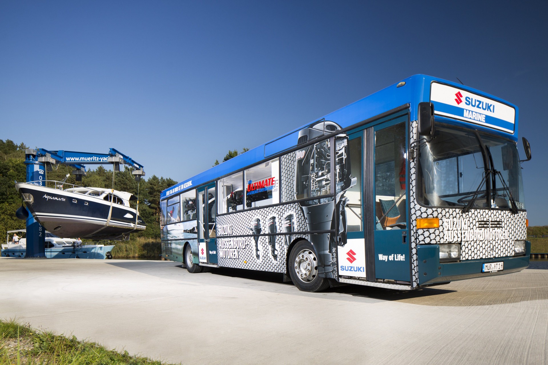 Auch wer bis jetzt nur mit dem Gedanken an Urlaub auf dem Wasser oder ein eigenes Boot gespielt hat, kommt beim „Tag der offenen Tür“ auf seine Kosten: Vorgestellt werden allerlei Neuheiten von Wassersportausrüstern. Angesagt hat sich unter anderem der SUZUKI-Showbus mit einer breiten Palette der Außenbordmotoren der Marke SUZUKI. Die Spezialisten aus dem Hause Suzuki stehen Interessierten für allerlei Fragen zur Verfügung.