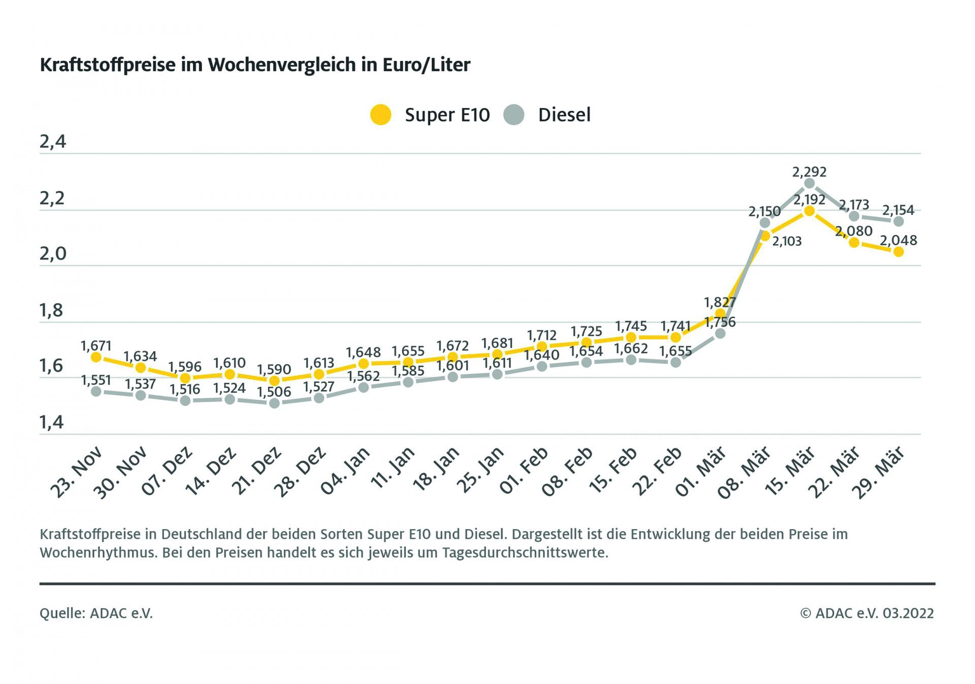 Die Kraftstoffpreise sind im Vergleich zur Vorwoche gesunken – gemessen am Rohölpreis und am Dollarkurs sind sie laut ADAC aber immer noch viel zu hoch. Die aktuelle ADAC Auswertung der Kraftstoffpreise zeigt, dass ein Liter Super E10 binnen Wochenfrist um 3,2 Cent gesunken ist und derzeit im bundesweiten Mittel 2,048 Euro kostet. Der Preis für einen Liter Diesel ist um 1,9 Cent gefallen und liegt aktuell bei 2,154 Euro. Die Kraftstoffpreise liegen damit laut ADAC weiter unangemessen hoch.