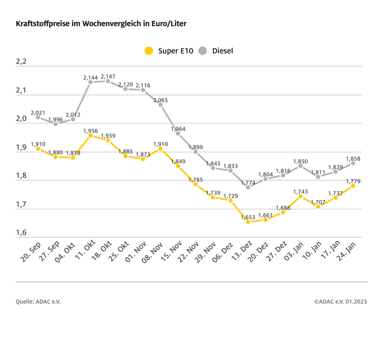 Die Autofahrer müssen beim Tanken erneut deutlich tiefer in die Tasche greifen als in der Vorwoche. Wie die aktuelle ADAC Auswertung der Kraftstoffpreise in Deutschland zeigt, hat sich insbesondere Benzin deutlich verteuert. Danach kostet ein Liter Super E10 im bundesweiten Mittel 1,779 Euro, das sind 4,2 Cent mehr als vor einer Woche. Auch Diesel ist teurer: Für einen Liter muss man aktuell 1,858 Euro bezahlen und damit 2,9 Cent mehr als vor einer Woche.