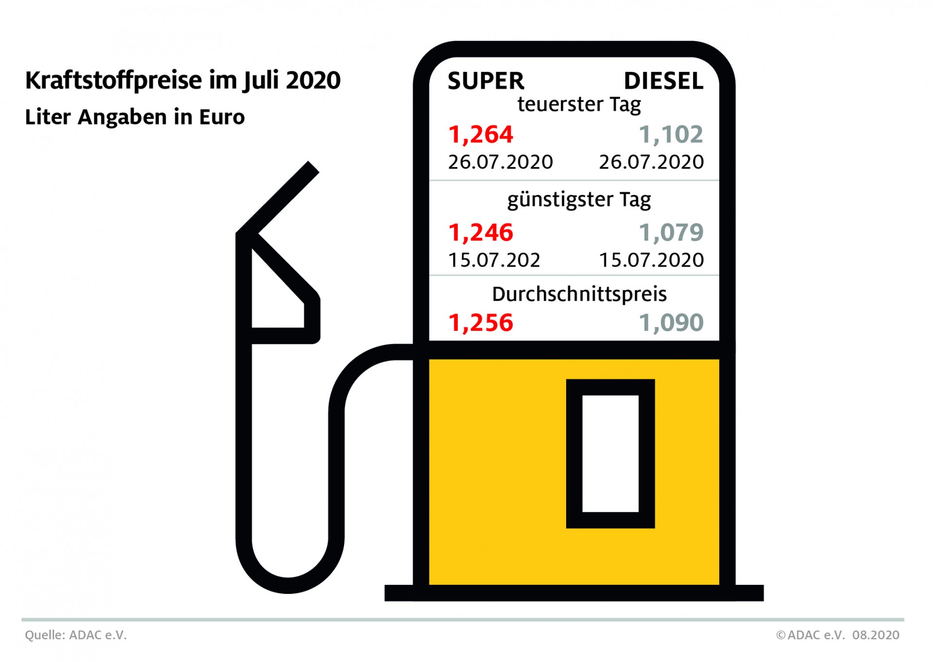 Am günstigsten war das Tanken am 15. Juli. An diesem Tag lag der Durchschnittspreis für Super E10 bei 1,246 Euro je Liter und für den Liter Diesel bei 1,079 Euro. Die bundesweite Preisdifferenz zwischen teuerstem und billigstem Tanktag betrug dadurch lediglich 1,8 Cent (Super E10) beziehungsweise 2,3 Cent (Diesel).