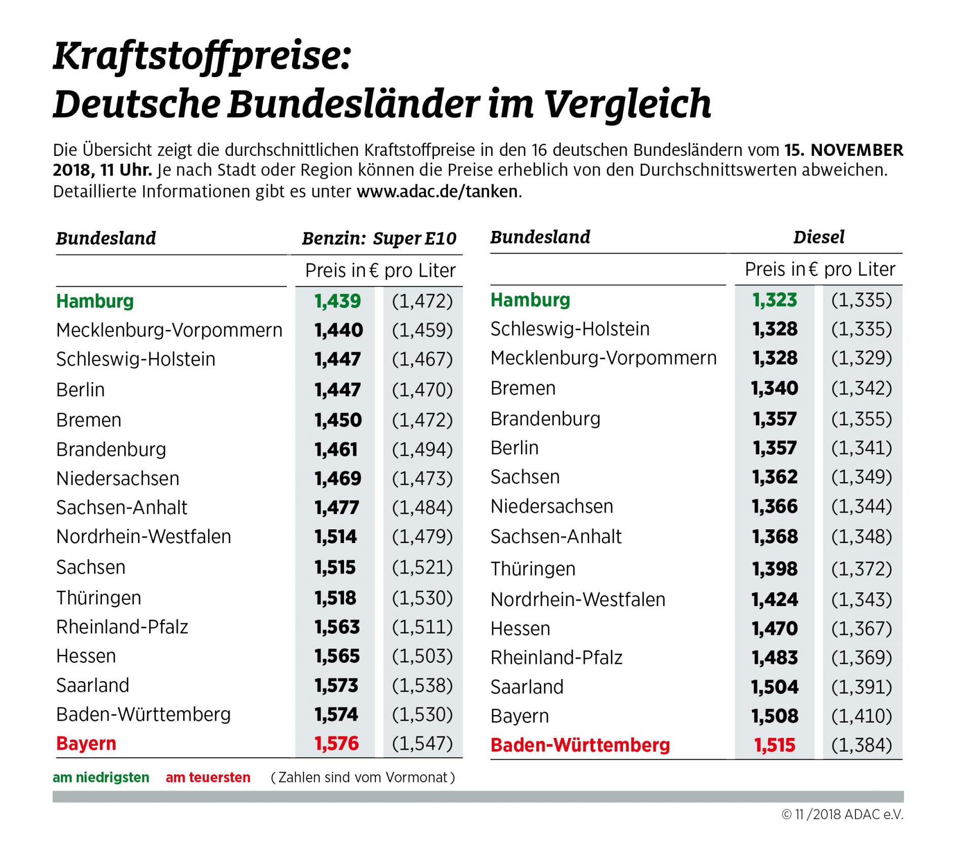 In der aktuellen Untersuchung hat der ADAC am heutigen Dienstag um 11 Uhr die Preisdaten von mehr als 14.000 bei der Markttransparenzstelle erfassten Tankstellen ausgewertet und den Bundesländern zugeordnet. Die ermittelten Preise stellen eine Momentaufnahme dar.