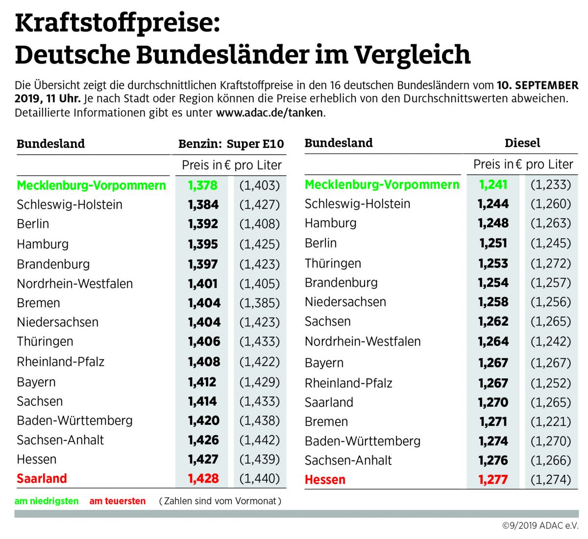 In der aktuellen Untersuchung hat der ADAC gestern um 11 Uhr die Preisdaten von mehr als 14.000 bei der Markttransparenzstelle erfassten Tankstellen ausgewertet und den Bundesländern zugeordnet. Die ermittelten Preise stellen eine Momentaufnahme dar.