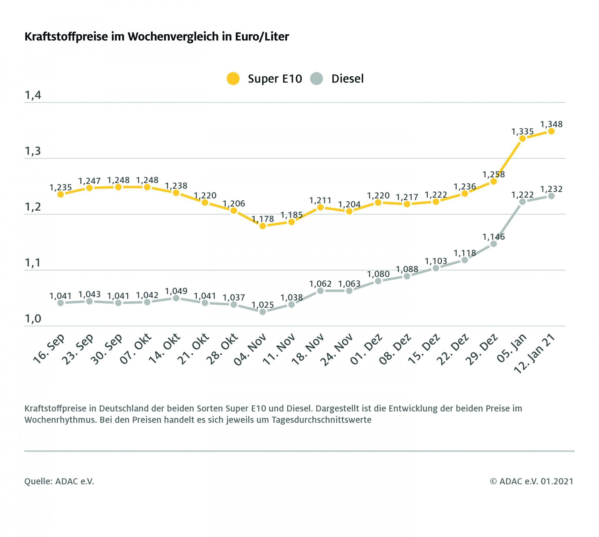 Nach dem kräftigen Preissprung zum Jahresbeginn ist Tanken in Deutschland binnen Wochenfrist erneut teurer geworden. Für einen Liter Super E10 müssen die Autofahrer derzeit im bundesweiten Mittel 1,348 Euro bezahlen, das sind 1,3 Cent mehr als vor einer Woche. Diesel verteuerte sich um einen Cent und kostet im Schnitt 1,232 Euro. Dies zeigt die aktuelle ADAC Auswertung der Kraftstoffpreise.