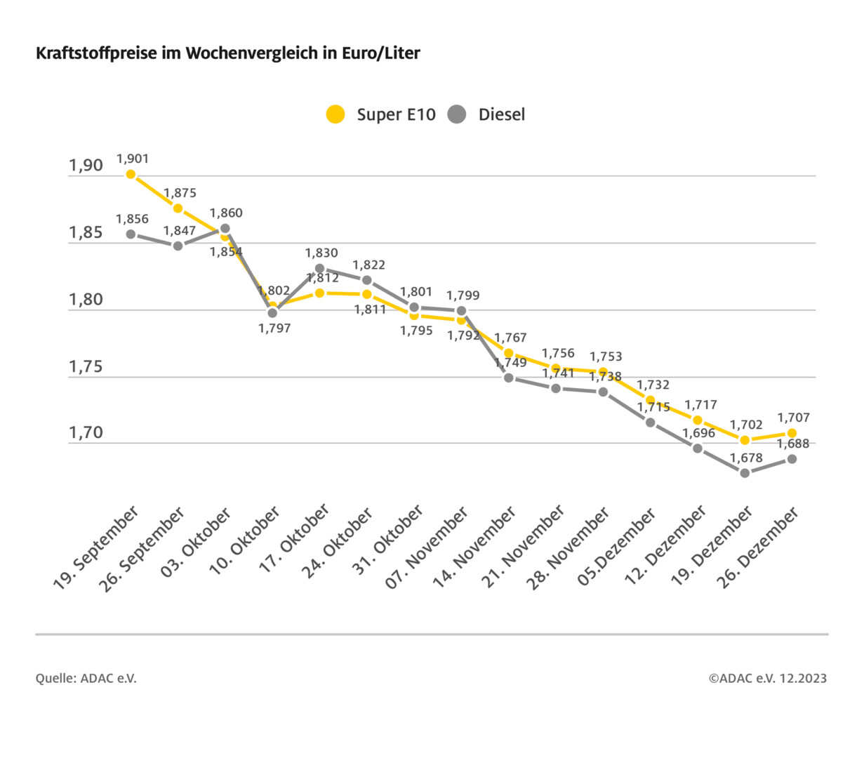 Nach neunwöchiger, ununterbrochener Talfahrt sind die Spritpreise in Deutschland erstmals wieder leicht gestiegen. Wie die aktuelle ADAC Auswertung der Kraftstoffpreise in Deutschland zeigt, kostet ein Liter Super E10 im bundesweiten Mittel 1,707 Euro und damit 0,5 Cent mehr als in der Vorwoche. Der Dieselpreis stieg seit der Vorwoche um einen Cent auf 1,688 Euro je Liter.