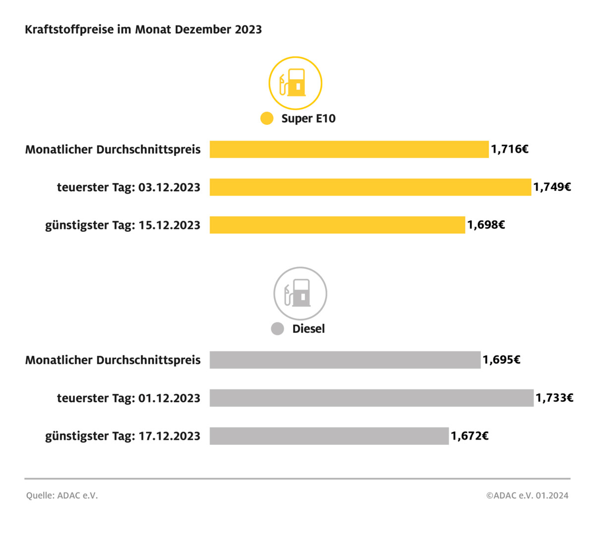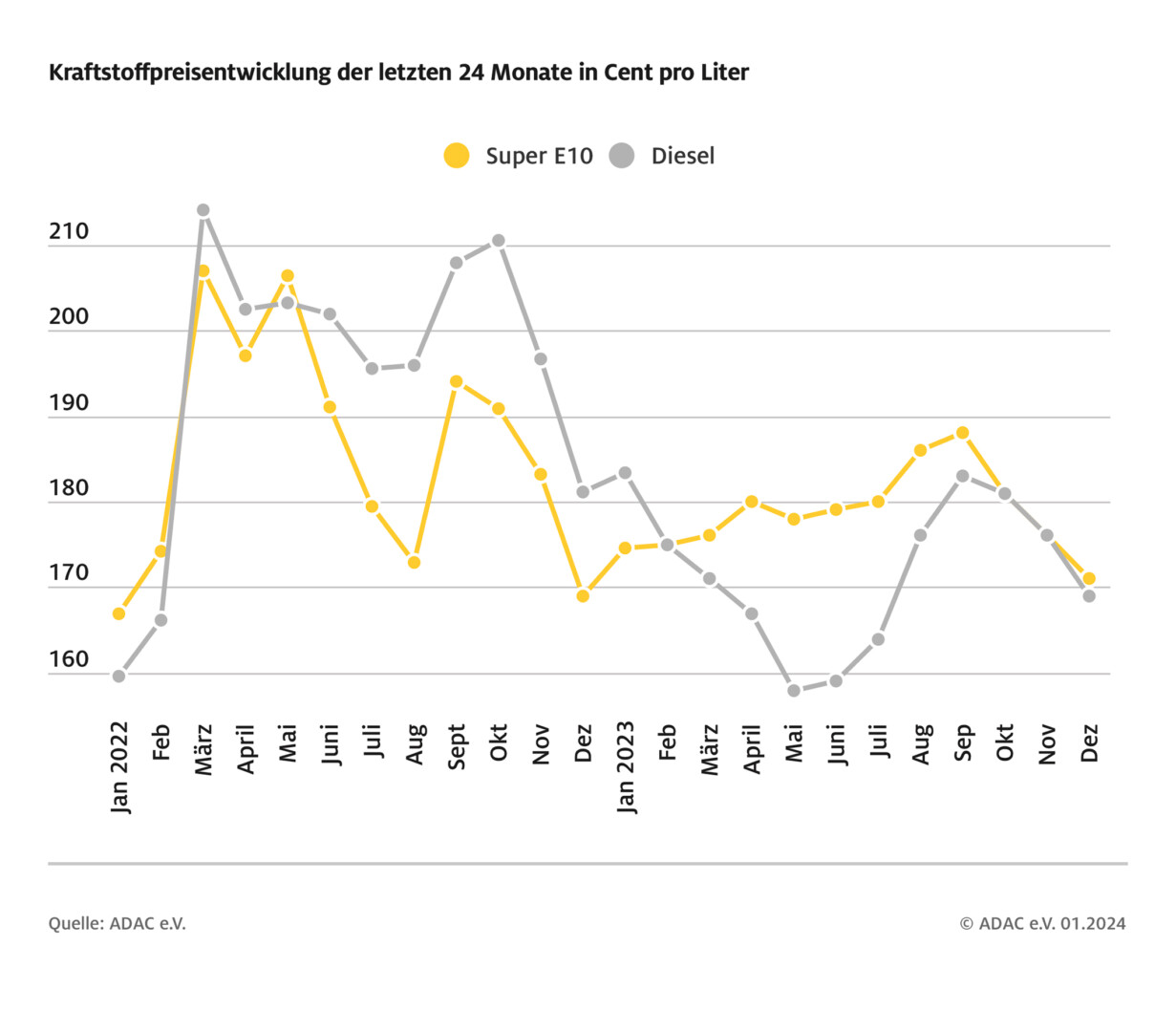 Das Jahresende lässt aus Sicht des ADAC darauf hoffen, dass sich die Preise 2024 auf einem ähnlichen Niveau wie zuletzt 2023 entwickeln werden, sofern sich nicht weitere gravierende Probleme oder Krisen ergeben, die zu einem deutlichen Ölpreisanstieg führen. So war Super E10 im Dezember des vergangenen Jahres am günstigsten: Ein Liter kostete hier im bundesweiten Mittel 1,716 Euro. Zum Vergleich: Der teuerste Tankmonat 2023 war für Super E10 der September. Damals wurden an der Zapfsäule im Bundesschnitt mit 1,884 Euro je Liter fast 17 Cent mehr fällig.