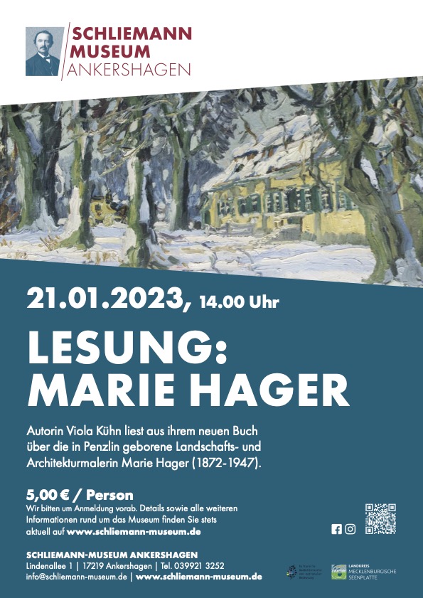 Autorin Viola Kühn liest aus ihrem Buch „Marie Hager“, das im Verlag „Atelier im Bauernhaus“ im Oktober 2022 erschienen ist. Marie Hager kultiviert auf ihren Bildern die Natur in ihrer Kraft und Bewegung der immerwährenden Lebensmusik. Die soziale und künstlerische Prägung der Malerin fällt in die Zeit der Freilichtmalerei und des Impressionismus. Sie erarbeitet sich einen eigenen Malstil und setzt mit lebensbejahender Farbigkeit Landschaften, Dorf- und Stadtansichten im Kreislauf der Jahreszeiten sowie Häfen ins Bild. Die Erzählung über ihr Leben orientiert sich an der durch ihren Bruder Ernst betriebenen Genealogie, versehen mit seinen persönlichen Erinnerungen, an erhaltenen Briefen und Dokumenten, an der Zeitgeschichte in Kunst und Gesellschaft sowie an überlieferten Erinnerungen an die Malerin.