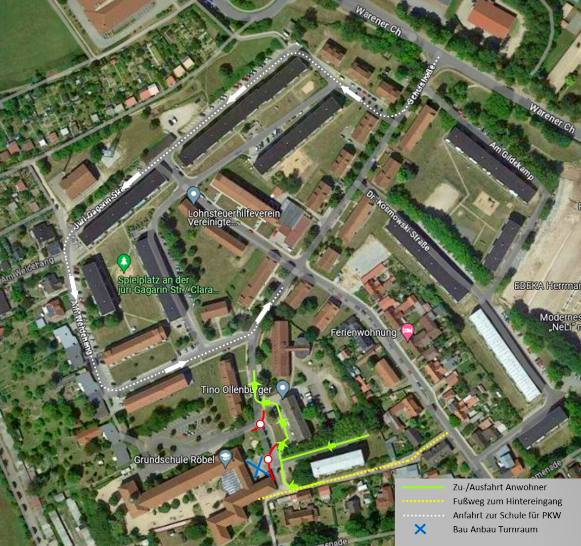 Um ein größtmögliches Maß an Sicherheit für die Kinder der Grundschule und des Hortes zu gewährleisten, bittet die Stadtverwaltung Röbel nochmals explizit alle Eltern, ihren Anfahrtsweg kritisch zu hinterfragen. „Nutzen Sie bitte die in der Skizze nochmals dargestellten Alternativen. Die Kinder, die den Fußweg über den Verbindungsweg von der Gustav-Melkert-Straße aus oder den Schwarzen Weg/Treppe nutzen, können das Schulgebäude fortan auch über den hinteren Eingang begehen.“