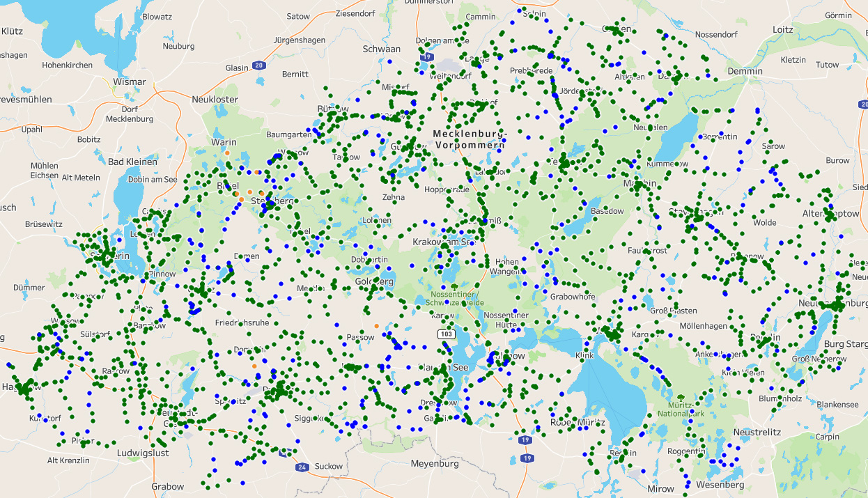 Die Deutsche Telekom hat in den zurückliegenden Wochen in der Urlaubsregion Mecklenburg umfangreiche Messfahrten durchgeführt, um die Mobilfunkversorgung detailliert zu analysieren. Spezialfahrzeuge durchquerten das Gebiet von Ludwigslust bis Neubrandenburg und von Mirow bis nach Gnoien (s. Grafik). Insgesamt wurden mehr als 4.000 Kilometer zurückgelegt und mehr als 34.000 Messungen in allen deutschen Mobilfunknetzen durchgeführt – darunter Sprachqualität, Datenraten beim Down- und Upload sowie Ping-Zeiten. Dafür sind in einer Dachbox eines Messfahrzeugs acht Smartphones verbaut, die ständig Gespräche aufbauen und Datenübertragungen vornehmen. „Bei der Planung unserer Mobilfunknetze spielen Berechnungstools eine zentrale Rolle – aber die Messfahrten sind unser Reality Check“, erklärt Andreas Neusinger, Projektleiter „Qualität vor Kunde“ bei der Telekom. Das befahrene Gebiet entspricht im Wesentlichen den Landkreisen Ludwigslust-Parchim, Mecklenburgische Seenplatte und Rostock.