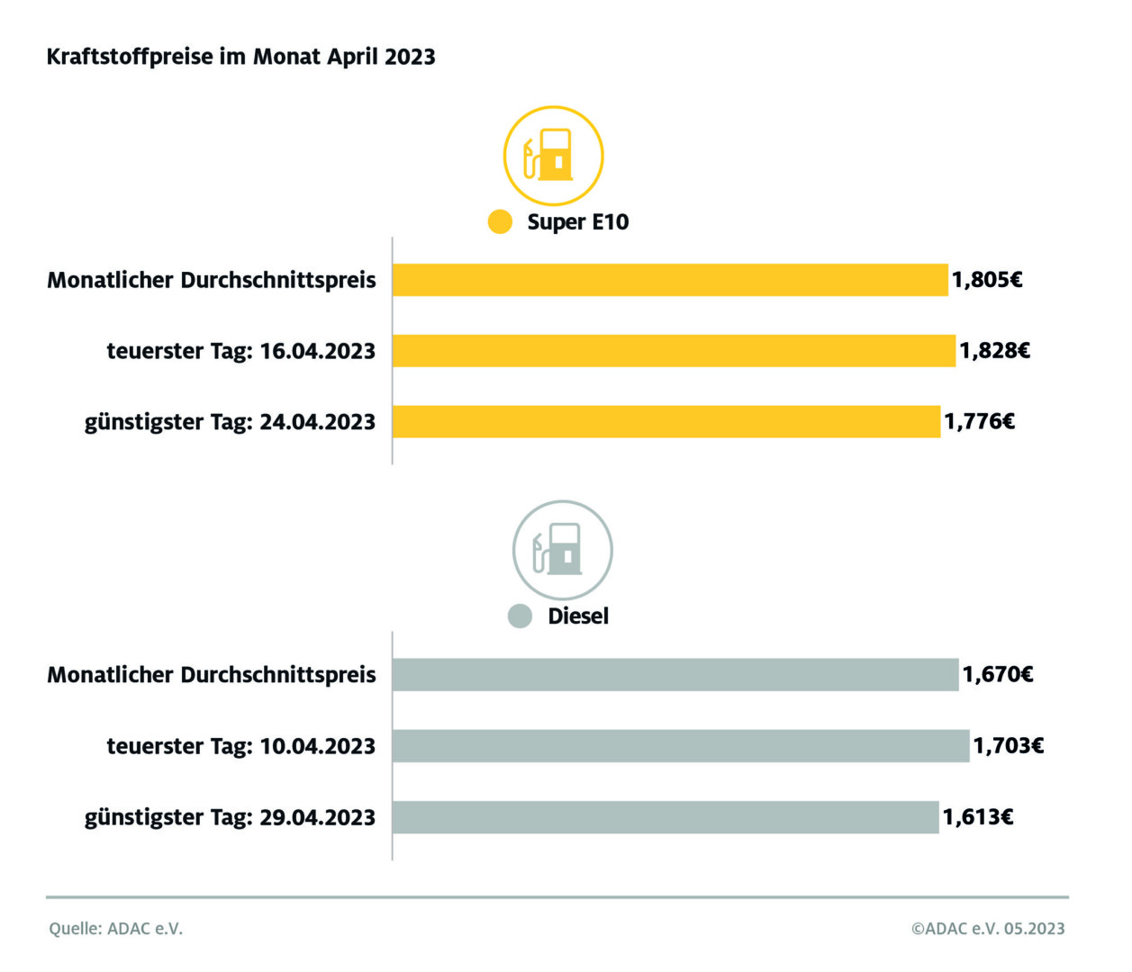 Die gegenläufige Preisentwicklung der beiden Kraftstoffsorten belegt nach Angaben des ADAC auch der Blick auf die günstigsten und die teuersten Tage zum Tanken im April. So war der 16. April für die Fahrer von Benzinern bei einem Preis von 1,828 Euro nicht nur der teuerste Tag des Monats, sondern auch des bisherigen Jahres 2023. Grund zur Freude hingegen für Dieselfahrer: Am 29. April fiel der Dieselpreis mit 1,613 Euro je Liter nicht nur auf den niedrigsten Stand des Monats, sondern auch des Jahres 2023.