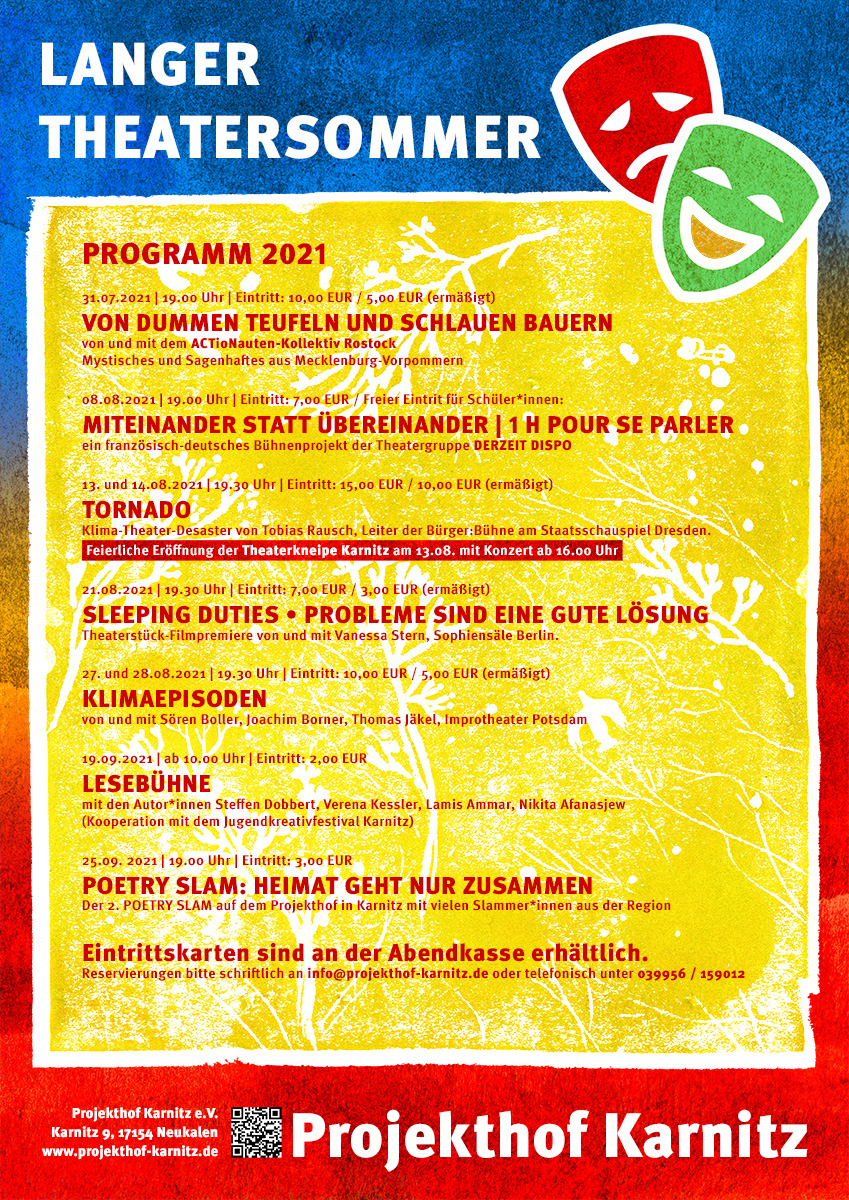Wo ist Karnitz? Da, wo ab dem 31. Juli den ganzen August über Theater am Wochenende stattfindet. In Karnitz bei Neukalen werden im August verschiedene Theatergruppen auftreten: die ACTionauten aus Rostock, das deutsch-französische Theaterprojekt „derzeit dispo“, der TheaterDiscounter Berlin, Vanessa Stern von den Sophiensälen und das Improtheater Potsdam. Die Stücke unterscheiden sich im Inhalt, aber auch in der Form: Da sind es Märchen – von Teufeln, Bauern und Nagern, die auf Reisen sind, Dokus mit echtem Tornado oder ein Improvisationstheater – also gespielte Episoden aus dem Stegreif.