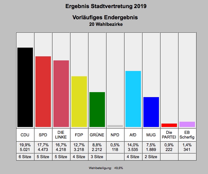 In der neuen Warener Stadtvertretung dürfte die AfD, die erstmals eingezogen ist, bei vielen Entscheidungen das Zünglein an der Waage sein. Denn weder das linke noch das konservative Lager verfügt über eine komfortable Mehrheit. Und das ist die Sitzverteilung: CDU 6 Sitze – minus 3, SPD fünf Sitze – minus 1, Linke 5 Sitze –minus 1, FDP 4 Sitze – plus 2, Bündnis 90/Grüne 3 Sitze – plus 2, MUG 2 Sitze – gleichbleibend, AfD 4 Sitze – plus 4. Normalerweise gehören zum Warener Stadtparlament 29 Abgeordnete. Da die AfD allerdings nur drei Kandidaten hat und somit ihre vier Sitze nicht belegen kann, sind’s nur 28 Stadtvertreter. Sehr erfreut äußerten sich zahlreiche „Neue“, dass es die NPD nicht mehr in die Warener Stadtvertretung geschafft hat.
