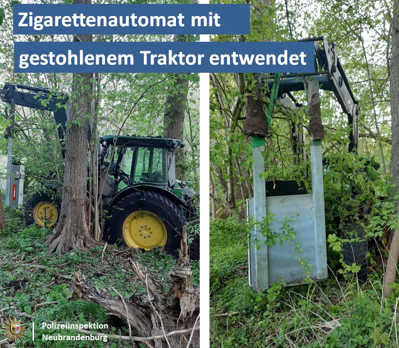 Bislang unbekannte Täter wollten heute früh gegen 3 Uhr in Pribbenow einen Zigarettenautomaten klauen und hatten sich dafür zuvor einen Traktor gestohlen. Der Automat war an einer Hauswand angebracht, die Täter rissen ihn mit dem Hubarm des Traktor heraus. Anschließend flüchteten sie mit Traktor und Automat in Richtung Voßhagen.