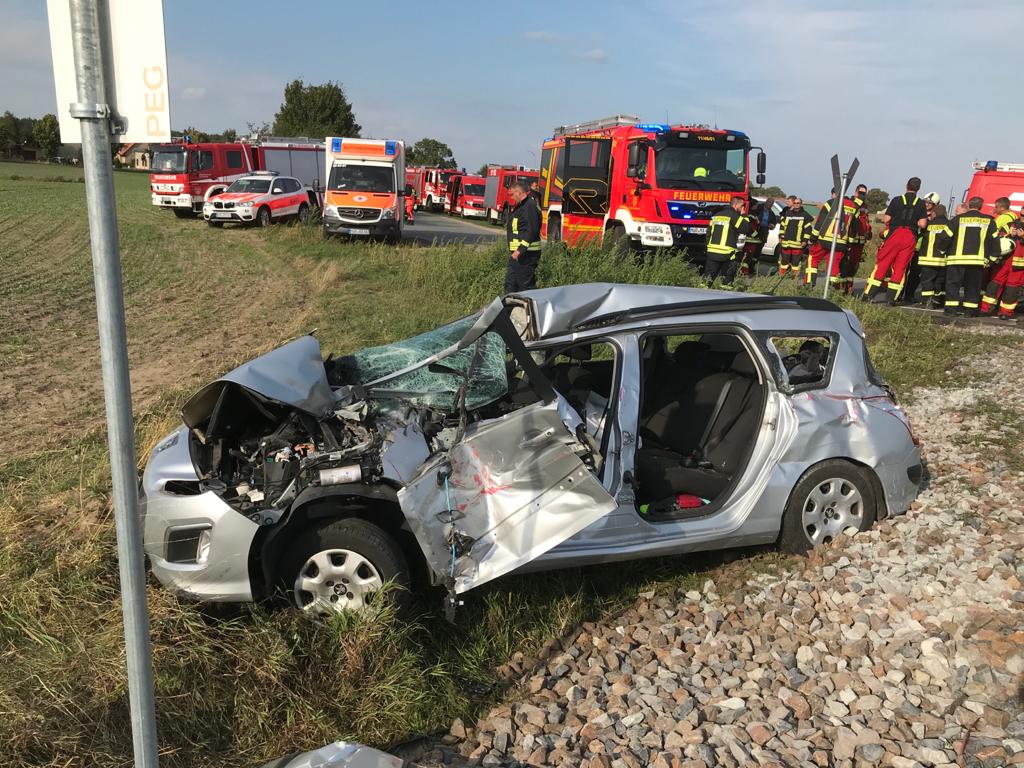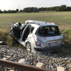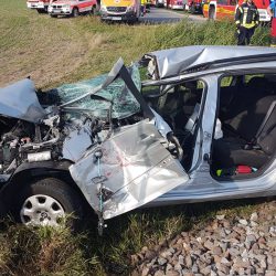 Dieser wurde ins angrenzende Gleisbett geschoben. Der Fahrzeugführer wurde schwer verletzt mit dem Rettungshubschrauber in ein örtliches Krankenhaus geflogen. Der 71-jährige Beifahrer sowie die beiden 64 und 68 Jahre alten Mitfahrerinnen wurden durch den Zusammenstoß leicht verletzt und durch Rettungskräfte in umliegende Krankenhäuser gebracht. An dem Peugot entstand ein Sachschaden von ca. 6.000 Euro.Zur Bergung der Unfallopfer war auch die Feuerwehr im Einsatz.