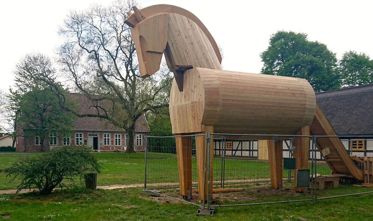 Im Bauch des „Pferdes“ saßen in der Sage die griechischen Krieger. Der Held Achilles hatte das Pferd vor der Stadt stehen gelassen, weil die Griechen die antike Stadt wegen ihrer hohen Mauern nicht einnehmen konnten. Die Trojaner nahmen an, dass das „Holzpferd“ zurückgeblieben war, zogen es in ihre Stadt und schlossen die hohen Tore. Das war der Fehler, würde man später sagen. Die Krieger kletterten nachts aus dem „Pferd“, öffneten den Feinden die Tore von innen und Troja wurde gestürmt, geplündert und vernichtet. Bis der Archäologe Schliemann (1822-1890) es wiederentdeckte.