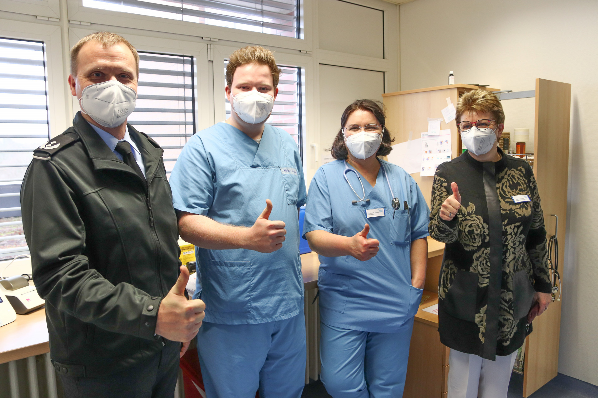 Bild oben: Daumen hoch für die Amtshilfe: Geschäftsführerin Gudrun Kappich (von rechts) und Chefärztin Dr. med. Regina Tanzer bedankten sich bei Robin Krauß und Oberstleutnant Christian Prchal.
