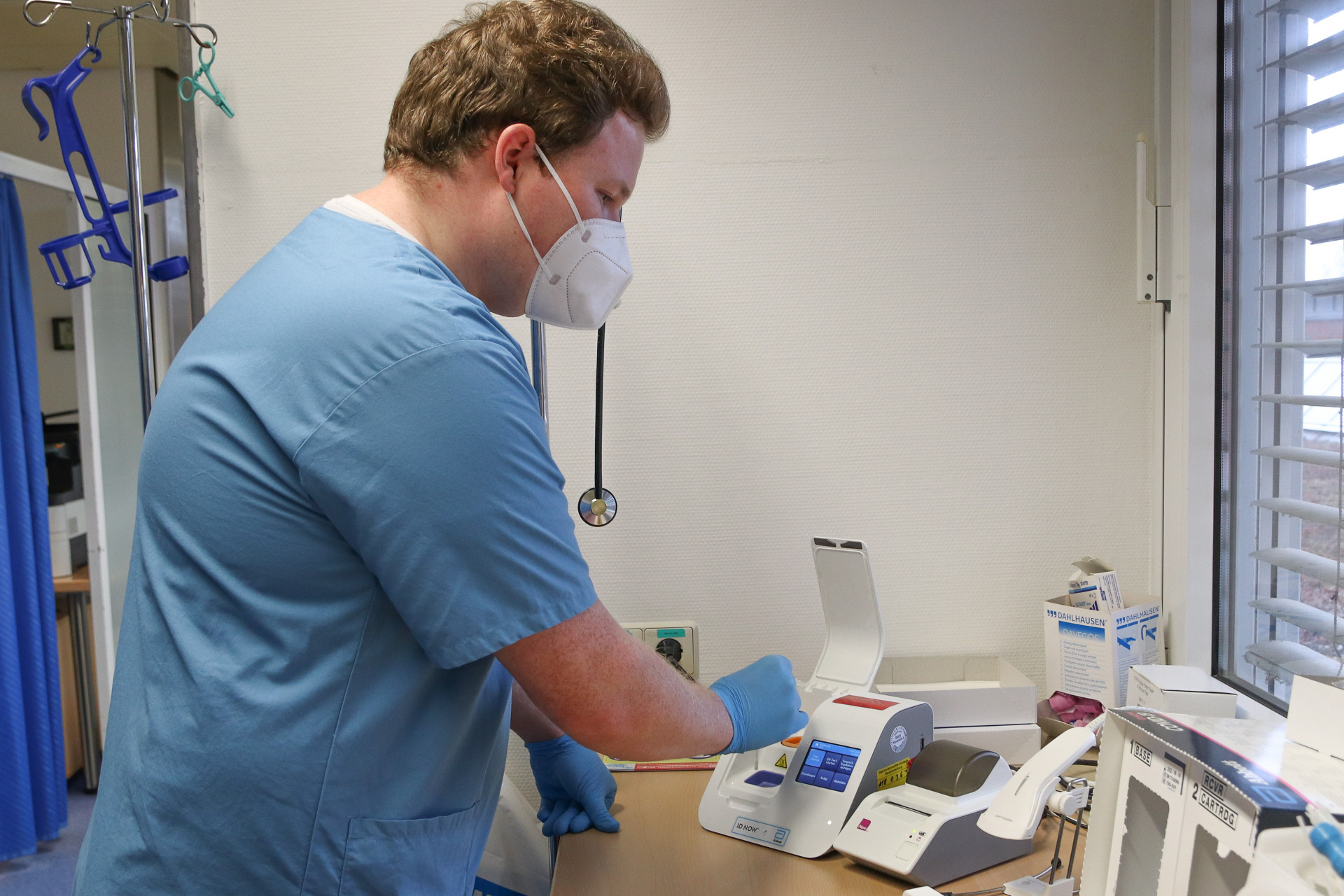 Bild im Text: Die meisten Abstriche in der Notaufnahme untersucht Robin Krauß mit dem „ID NOW“, einem Gerät, das durch sogenannte PoC-NAT-Tests schon nach wenigen Minuten ein Ergebnis liefert.
