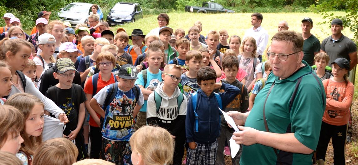 Begrüßt wurden alle Kinder mit dem „Jägerhändy“, denn das Jagdhorn ist noch immer im Einsatz, um sich über weite Entfernungen zu verständigen. Es kam im grünen Klassenzimmer immer dann zum Einsatz, wenn die einzelnen Klassen zur nächsten Station wechselten, von denen es insgesamt acht gab. An denen erfuhren die Kinder etwas über den Nestbau der Vögel, den Lebensraum von Wildsau, Dachs oder Fuchs, und auch die Bäume der heimischen Wälder standen auf dem Lehrplan. Beliebt war wieder die Arbeit der Hunde bei der Jagd, und die Kräuter konnten viele Kinder schon am Geruch erkennen. Die letzte Station war das Schüsseltreiben, wo sich die etwa 100 hungrigen Schüler vor der Abreise stärken konnten.