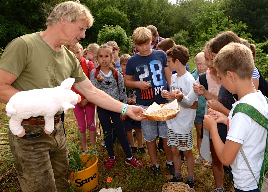 Aus Waren reiste Dr. Wolfgang Gerlach mit seiner Ehefrau extra in den südlichen Zipfel der Müritz-Region. „Wir sind gerade frisch im Ruhestand. Da engagieren wir uns gerne für so eine tolle Sache“, erzählte Elke Gerlach und stand den Bauern Andreas Nietiedt und Helmut Solf hilfreich zur Seite, die in diesem Jahr ebenfalls das erste Mal dabei waren. In einem unterhaltsamen Puppenspiel lernten die Kinder von ihnen etwas über die Aufzucht von Schweinen und Kühen und welches Futter sie fressen. Einige Kinder sahen zum ersten Mal getrocknete Erbsen und erfuhren, dass sie eine gute Eiweißquelle für Mensch und Tier sind. Am Ende spielten sie Bauernball, mit dem was die Natur zur Verfügung stellte, denn die Bälle wurden aus Pflanzen vom Wegesrand gebastelt.