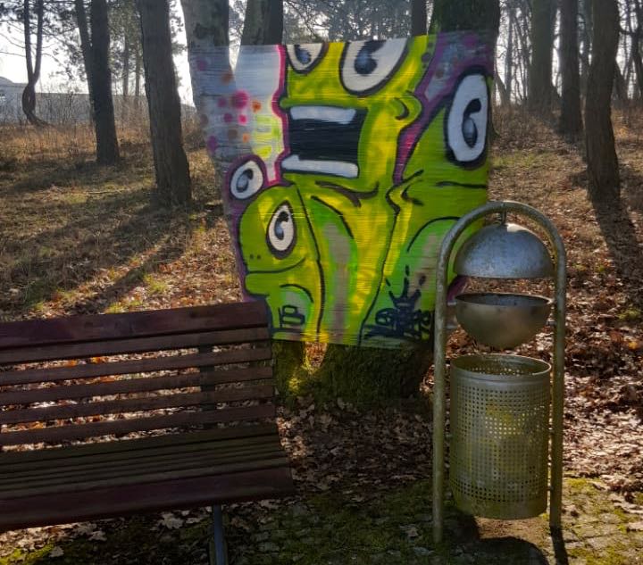 Da war es wohl jemandem zu trist im Kurpark auf dem Nesselberg: Unbekannte Künstler haben Farbe in den Park gebracht: Folie gespannt und losgelegt.