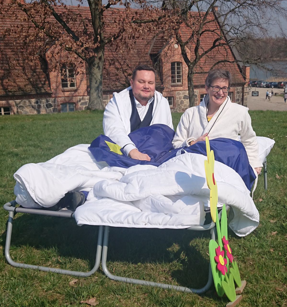Im Osten passiert vieles zum ersten Mal in Deutschland, stand auf einem Aufsteller. Und so kuschelten die beiden MV-Liberalen auch vor Kameras mal unkonventionell im Bett vor der Ulrichshusener Kulisse.
