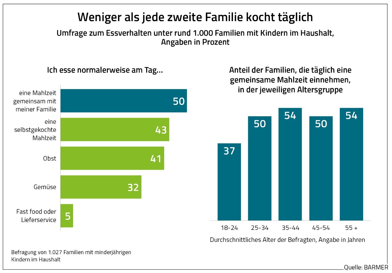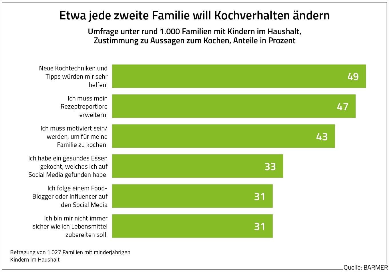 Laut der BARMER-Umfrage sind den meisten Familien gute Nahrungsmittel wichtig. Je nach Einkommen legen mindestens 71 Prozent Wert auf gesunde und zumindest 85 Prozent auf qualitativ hochwertige Lebensmittel. 15 Prozent aller Familien setzen dabei ausschließlich auf Bio-Produkte und 75 Prozent auf einen Mix mit konventionellen Lebensmitteln. Dagegen ist nur zwölf Prozent der Befragten die regionale Herkunft der Lebensmittel wichtig.