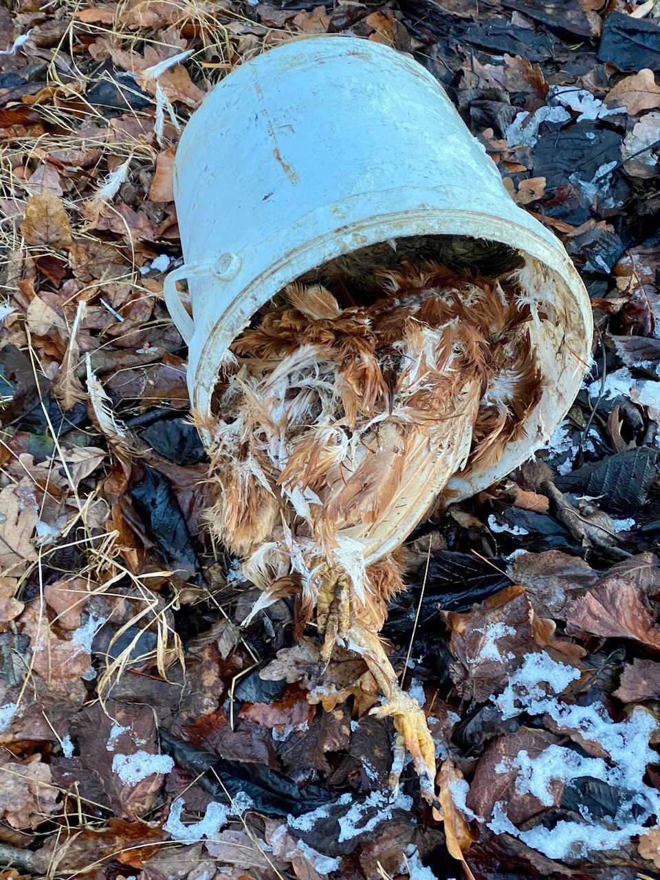Gestern nun machten Spaziergänger im Bereich der Meierei eine schlimme Entdeckung: Am Waldrand lagen fünf tote Legehennen, eine Ente und ein Kanichen. Ein Huhn steckte noch im Eimer.