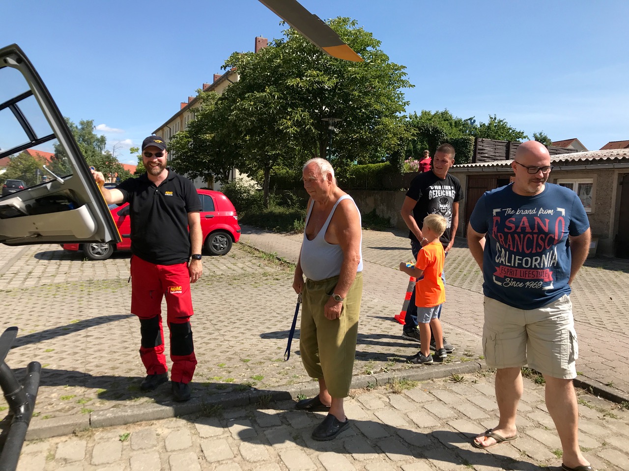 „Das ist kein Problem, wir sind ja zu dritt, einer öffnet die Tür und guckt, ob alles frei ist“, berichtet der Pilot, der auch den Anwohnern und Kindern, die neugierig schauten, Rede und Antwort stand. Er ließ sie in das Innere der „fliegenden Intensivstation“ schauen und beantwortete viele Fragen. Eine Klimaanlage wie inzwischen in den meisten Autos gibt es im Rettungshubschrauber übrigens nicht.