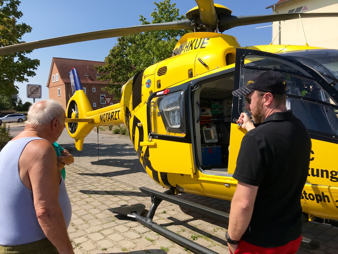 „Das ist kein Problem, wir sind ja zu dritt, einer öffnet die Tür und guckt, ob alles frei ist“, berichtet der Pilot, der auch den Anwohnern und Kindern, die neugierig schauten, Rede und Antwort stand. Er ließ sie in das Innere der „fliegenden Intensivstation“ schauen und beantwortete viele Fragen. Eine Klimaanlage wie inzwischen in den meisten Autos gibt es im Rettungshubschrauber übrigens nicht.