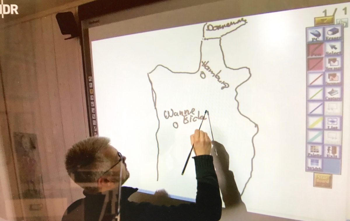 Der Mann aus Hamburg soll Schülern auf den Faröer-Inseln die Umrisse von Deutschland aufzeichnen. Was kommt dabei heraus: Der Korrespondent malt nur die Umrisse des alten Westdeutschland – und das im Jahr 2015, als die Reportage gedreht wurde. Weder Müritz, noch Rügen, nach ganz Mecklenburg-Vorpommern, noch Berlin, noch irgendwas aus ganz Ostdeutschland zeichnet der „ARD-Experte“.