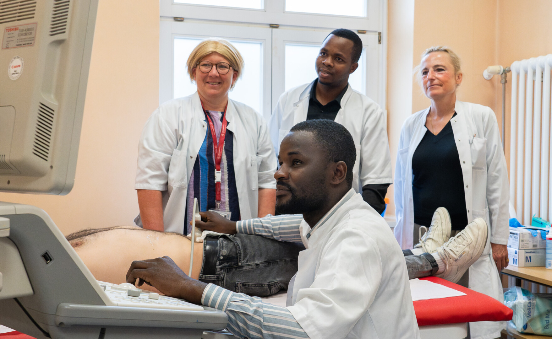 Langsam fährt der Kinderchirurg Dr. Langa Michael Langa aus Tansania unter den aufmerksamen Blicken von zwei erfahrenen Kinderchirurginnen der Unimedizin Rostock mit der Ultraschallsonde über den Bauch eines Studenten und schaut konzentriert auf die Schallbilder des Darms. Gemeinsam besprechen die Ärzte, was auf dem Monitor zu sehen ist. Dies gehört zu den Fertigkeiten, die Langa während seines dreiwöchigen Aufenthaltes in der Kinderchirurgie vertieft hat. Er und der Pfleger Emmanuel Ndalahwa Kifalu arbeiten in der Kinderklinik des Bugando Medical Centers in Mwanza/Tansania und spezialisieren sich dort auf die Behandlung von Kindern mit angeborenen Darmfehlbildungen. Dabei stehen ihnen die beiden Expertinnen Prof. Dr. Stefanie Märzheuser und Dr. Judith Lindert zur Seite, die bereits mehrmals zu einem Arbeitsaufenthalt in Tansania waren und ihr umfangreiches Wissen gerne weitergeben.