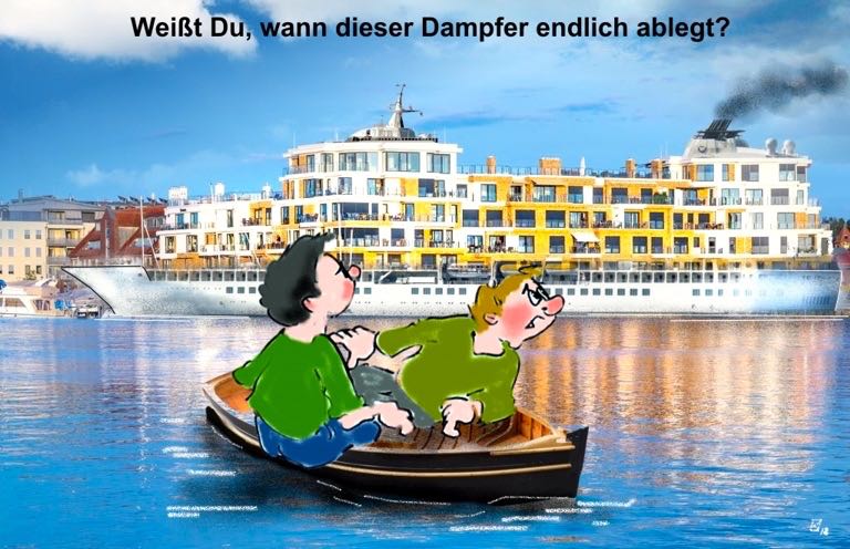 „Es wäre schön, wenn dieser Bau nun endlich den Hafen wieder verlassen würde – wie jedes anständige Kreuzfahrtschiff“, meint unser Zeichner Joachim Kluge mit Blick auf den Warener Hafen.