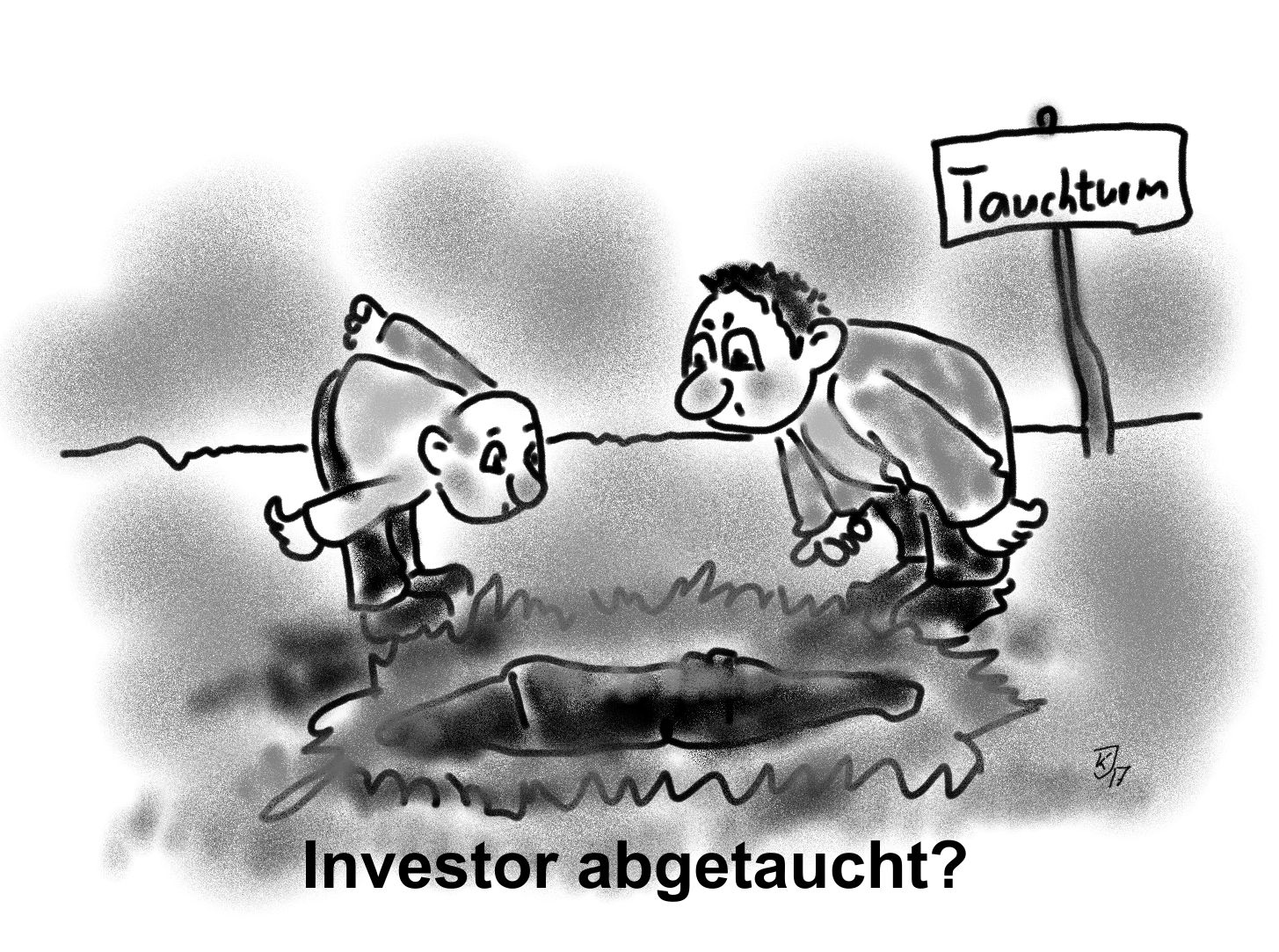 So wie unser Zeichner Joachim Kluge hoffen wir auch, dass der Investor des Aqua Regia Parks mit Tauchturm auf dem Nesselberg nur die Tauchtiefe ergründet und nicht ganz und gar abgetaucht ist.