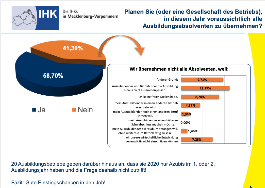 Gute Nachrichten für alle Auszubildenden und Jugendlichen, die bald eine Lehre beginnen wollen: Trotz der momentanen Corona-Situation ist die Ausbildungsbereitschaft der IHK-Ausbildungsbetriebe im Land ungebrochen hoch. Wie aus einer aktuellen Blitz-Ausbildungsumfrage der Industrie- und Handelskammern in Mecklenburg-Vorpommern hervorgeht, führten 80 Prozent der befragten Unternehmen ihre Berufsausbildung organisatorisch unverändert im Unternehmen fort, während ein Fünftel mobiles Lernen praktizierte. Überdies wollen rund 60 Prozent der antwortenden Unternehmen ihre Auszubildenden nach dem erfolgreichen Abschluss ihrer Berufsausbildung übernehmen.