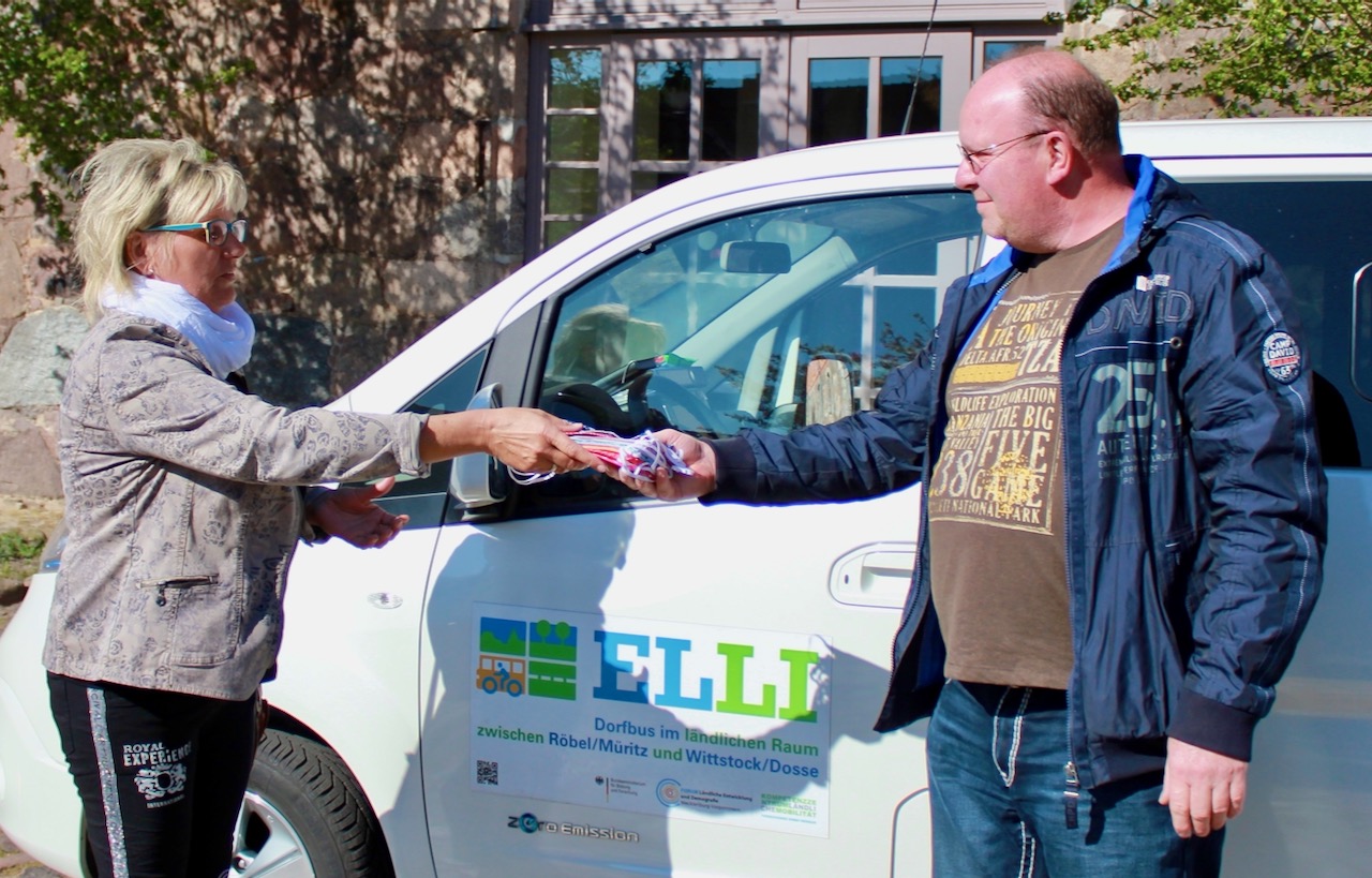 Seit gestern gibt’s im Elli Bus – ein Nachbarschaftsfahrdienst im Elde-Quell-Gebiet – auch Stoffmasken. Dank Elke Walter aus dem Laden „Nadeldesign“ der Scheune Bollewick (Tel. 01705479167). Sie hat 10 Masken an Herrn Goldstern übergeben, ein Geschenk an die Fahrer und Mitreisende, die noch keinen eigenen Mundschutz haben.