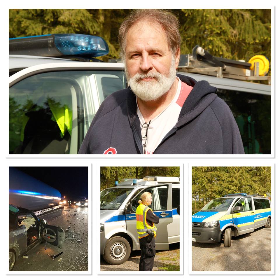 „Es gab einen Knall, der Wagen zog rechts rüber, dann drehten wir uns. Dann sah ich den Schwerlaster und dachte, dass war’s jetzt“, schildert Hans-Joachim Hoffmann den dramatischen Unfall. „Als wir zum Stehen kamen, brauchte ich ein paar Sekunden bis ich realisierte, dass ich noch am Leben bin.“ Hans-Joachim Hoffmann steigt nur Sekunden nach dem Crash aus, sieht wie sein Hund „Rudi“ aus dem Auto springt und davonläuft. „Ich musste mich um meine Frau kümmern“, sagt Hans-Joachim Hoffmann. Die Fahrer des Schwerlasters und deren Begleiter stoppten inzwischen den Verkehr. „Alle haben sofort geholfen, leisteten Erste Hilfe bis der Notarzt kam.“