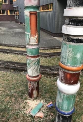 Durch den Bewurf sind Tonelemente der Skulptur abgebrochen. Außerdem wurden zwei ebenfalls im Innenhof stehende Wäscheständer beschädigt.