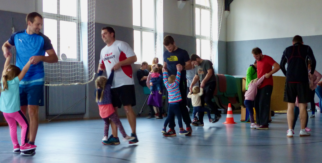 Unter dem Motto „Durcheinander, Miteinander und Gegeneinander“ startete der Sportvormittag mit einem wirbeligen Fangspiel mit Namen „Virus“, bei dem es kreuz und quer durch die gesamte Halle ging. Die anfängliche Schüchternheit einiger Teilnehmer war sofort verschwunden, und so konnte es auch schon mit den bunt vorbereiteten Parcours weitergehen. Dort fanden jede Menge lustige Wettbewerbe zwischen den Kindern und Vätern statt.