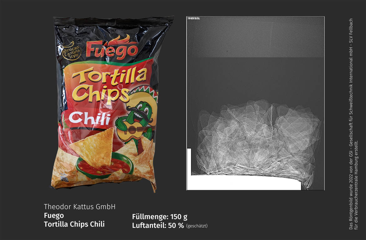 Die Auswirkungen der hohen Inflation mit rasant gestiegenen Preisen für Lebensmittel und Waren des täglichen Bedarfs bekommen Verbraucher derzeit schmerzhaft zu spüren. Dass sie zusätzlich oft Geld für viel abgepackte Luft bezahlen müssen, zeigt eine aktuelle Stichprobe der Verbraucherzentrale Hamburg. Zwischen 50 und 95 Prozent liegt der geschätzte Luftanteil bei insgesamt 15 beispielhaft auf Basis von Verbraucherbeschwerden ausgewählten Produkten, die die Verbraucherschützer mit Hilfe von Röntgenaufnahmen haben durchleuchten lassen.