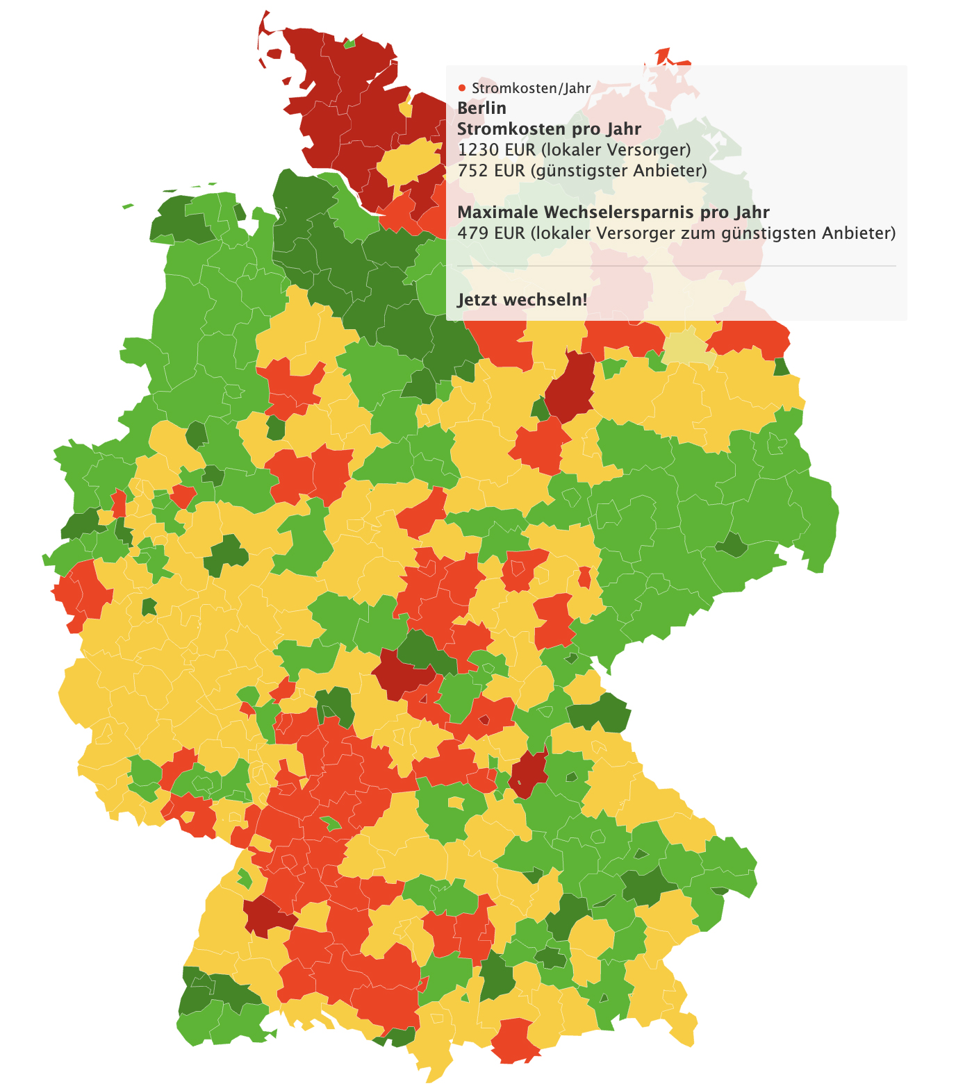 Im Mouseover werden die jährlichen Stromkosten für den lokalen Versorger, den günstigsten Alternativanbieter sowie die Wechselersparnis bei einem Anbieterwechsel von der Grundversorgung zum günstigsten Anbieter angezeigt. Durch Klick auf die jeweilige Region gelangen Verbraucher auf eine ausführliche Detailseite über Ihren lokalen Strommarkt und können dort mit wenigen Klicks den Anbieter wechseln.