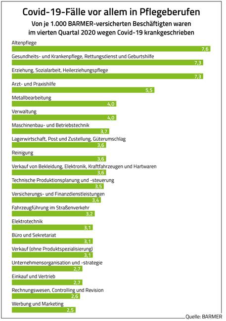 In keiner anderen Berufsgruppe Deutschlands sind so viele Beschäftigte am Coronavirus erkrankt wie in der Altenpflege. Dies geht aus einem aktuellen Branchenvergleich der BARMER hervor. Dabei wurden die 20 Berufsgruppen mit den anteilig meisten Covid-19-Erkrankten ermittelt. So waren im vierten Quartal vergangenen Jahres 7,6 je 1.000 BARMER-versicherten Erwerbstätigen in der Altenpflege wegen einer Covid-19-Infektion krankgeschrieben. Nur knapp dahinter folgen Beschäftigte in Gesundheits- und Krankenpflege, Rettungsdienst, Geburtshilfe sowie Erwerbstätige in Erziehung, Sozialarbeit und Heilerziehungspflege mit jeweils 7,3 je 1.000 Betroffenen.