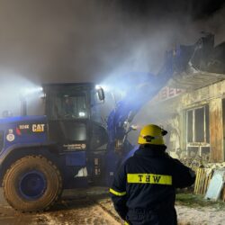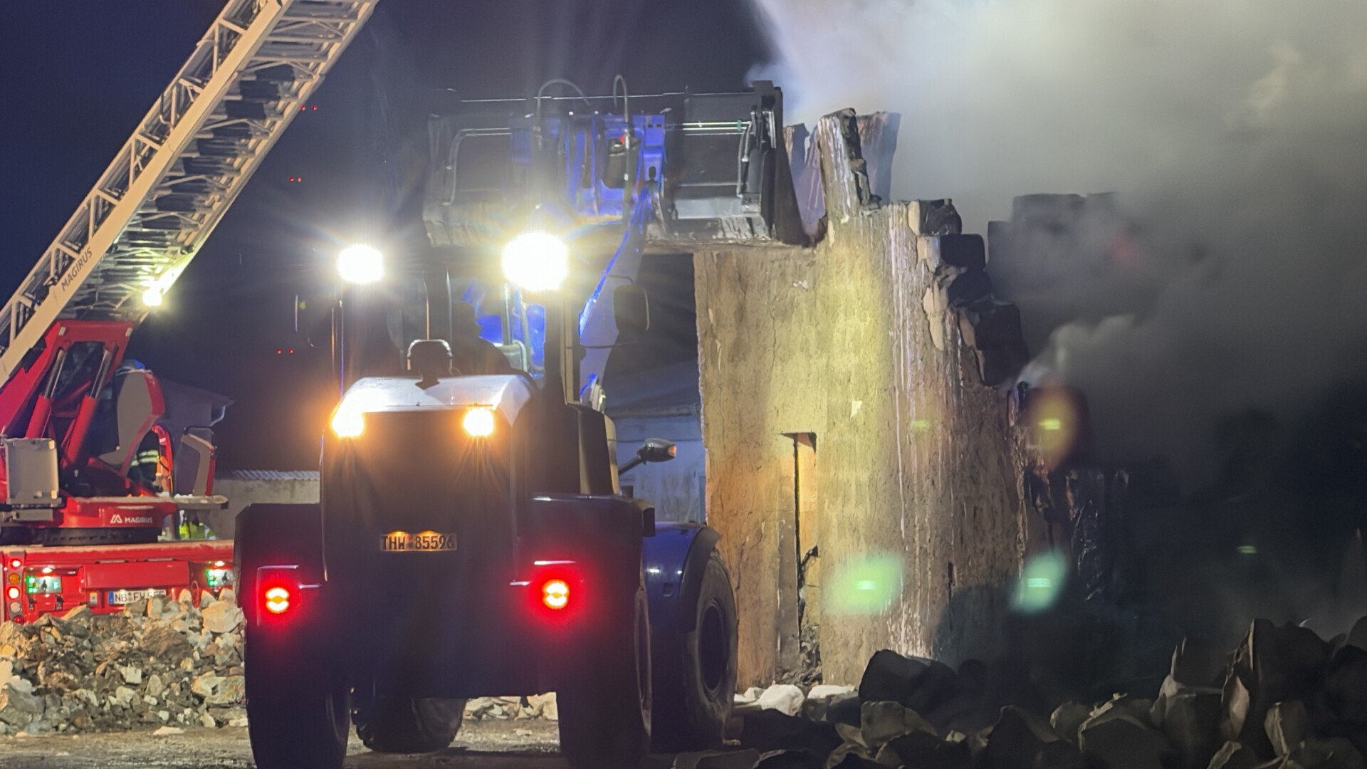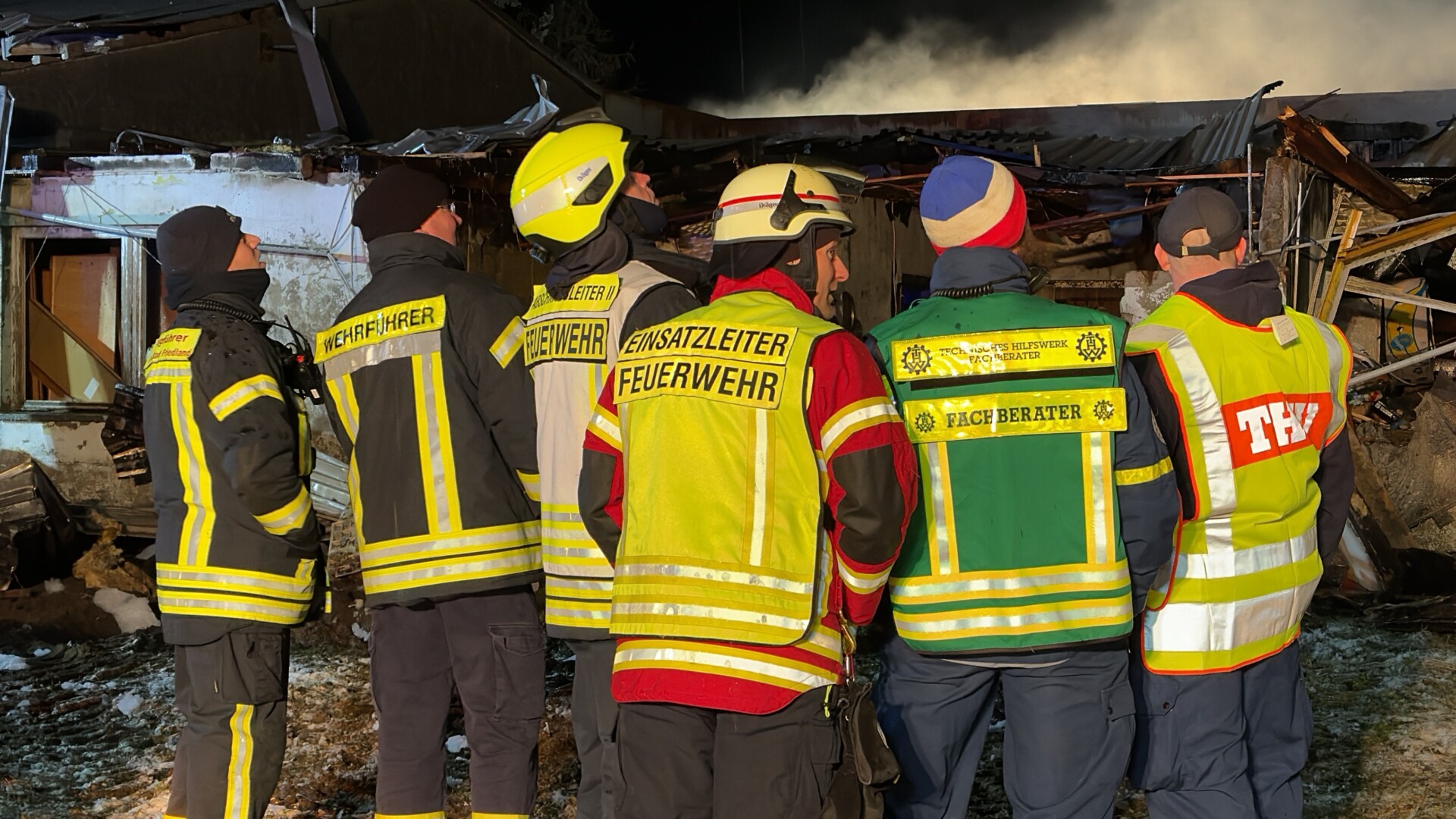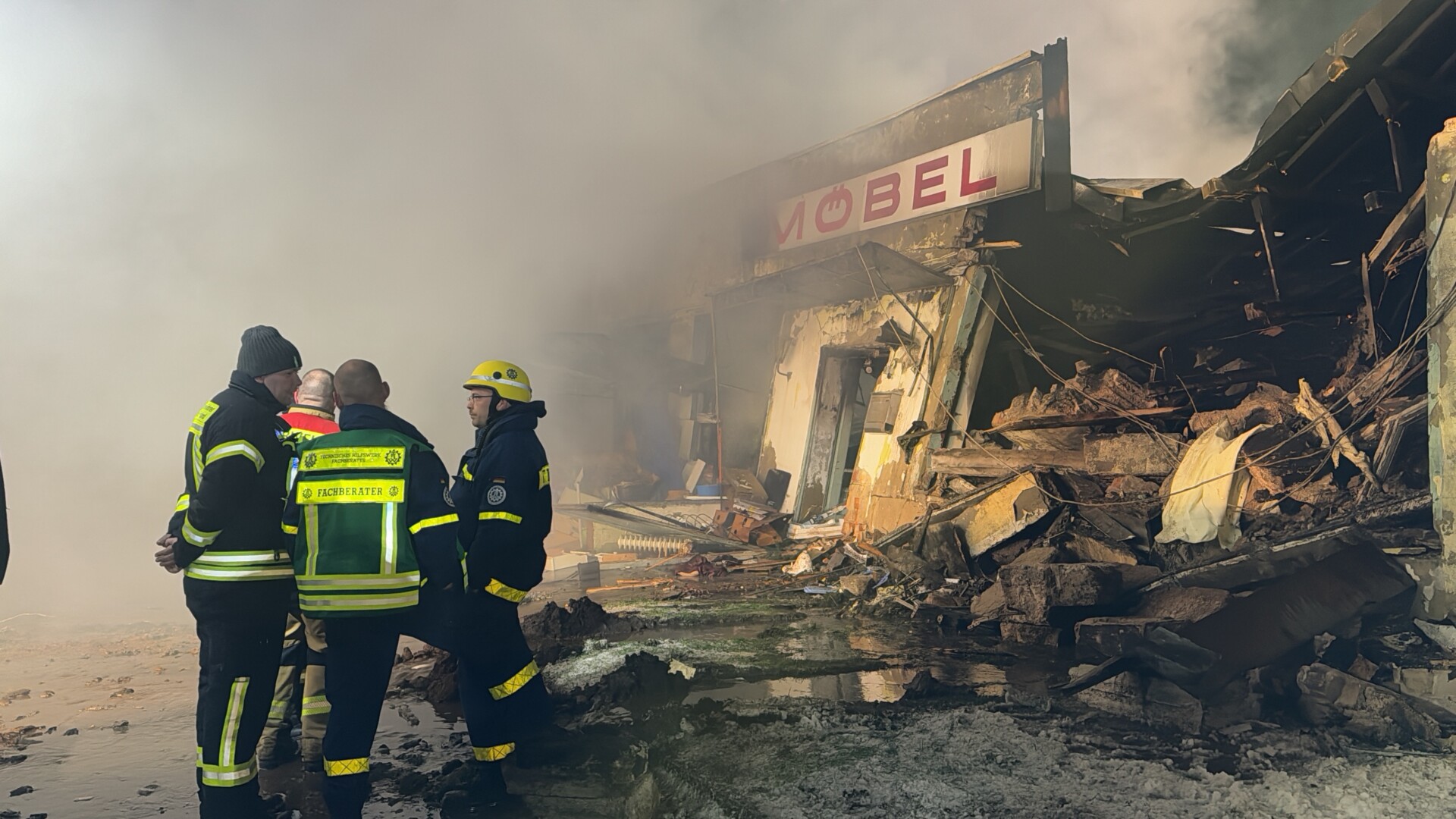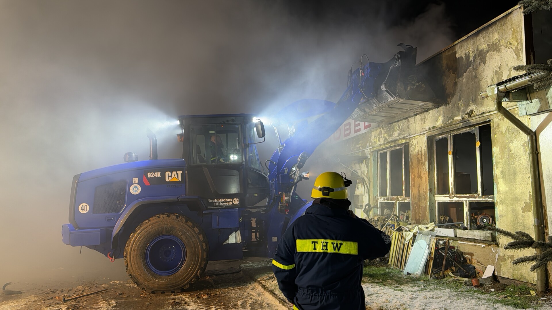 Angesichts der Schwierigkeiten bei der Löschwasserversorgung entschied Gersemann, das Technische Hilfswerk (THW) hinzuzuziehen. Durch das bereits am Nachmittag zum Teil eingestürzte Mauerwerk war klar, dass das Gebäude weiter zusammenbrechen würde. Durch die starke Einsturzgefahr entschied die Einsatzleitung dann, die Wände des Gebäudes einzudrücken, sodass im weiteren Verlauf keine Gefahr mehr davon ausging. Bei diesem Vorhaben unterstützte das Technische Hilfswerk mit einem Radlader.