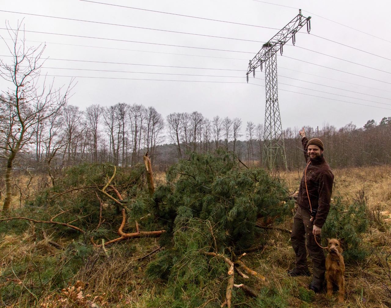 Bild: Revierleiter Johannes Herweg begutachtet die Maßnahme und zeigt eines der Nester in den Strommasten.