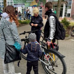 Bianca Schröder, Präventionsberaterin der Polizeiinspektion Neubrandenburg, überprüfte vor Ort die mitgebrachten Fahrräder auf Verkehrssicherheit, ein Kollege von codierte die Fahrräder.