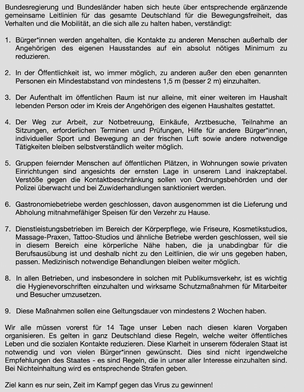 Die Maßnahmen werden verschärft: Die Bundeskanzlerin hat heute unter anderem ein Kontaktverbot verkündet. Mehr als zwei Menschen dürften sich nicht treffen, Familien ausgenommen.