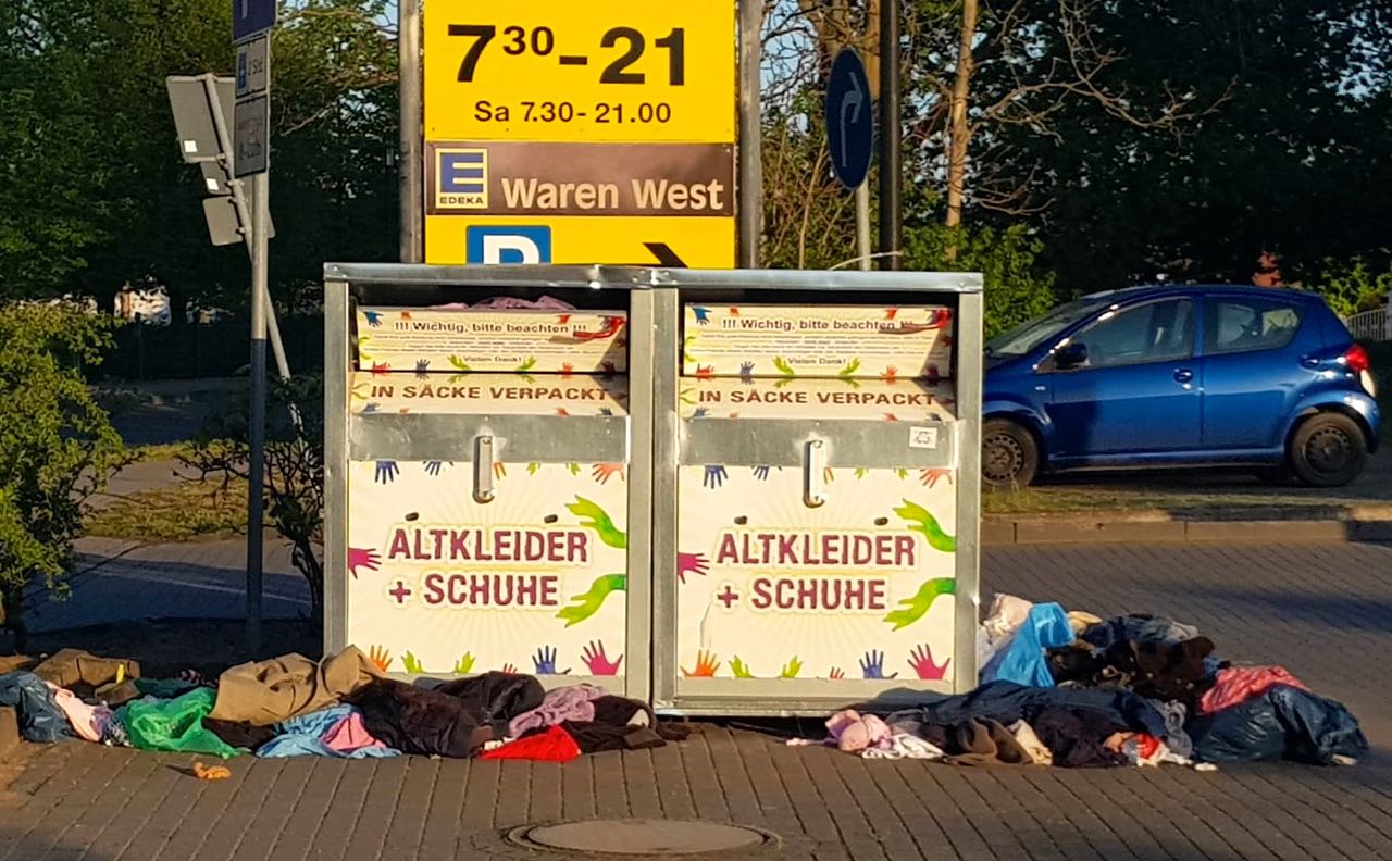 So sieht’s an den Kleidercontainern in der Nähe des Netto-Marktes Waren-West aus. Wie uns Anwohnerin Lisa berichtet, ist das nicht erst seit gestern so, sondern seit Wochen.