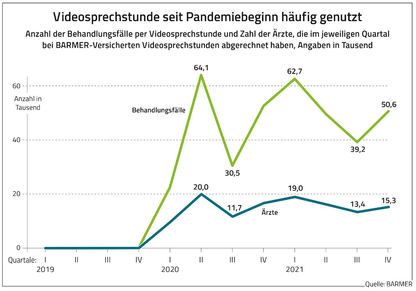 Die Nachfrage nach Videosprechstunden ist seit Beginn der Corona-Pandemie massiv gestiegen. Das zeigt eine Analyse der Barmer von Daten aus den Jahren 2019 bis 2021. Demnach beanspruchten Versicherte der Kasse die digitale Konsultation ihrer Ärzte in dieser Zeit mindestens 372.000 Mal. Am häufigsten geschah dies mit 64.000 Mal im zweiten Quartal 2020. Im Jahr 2019 war die Konsultation auf Distanz nur rund 250 Mal genutzt worden.