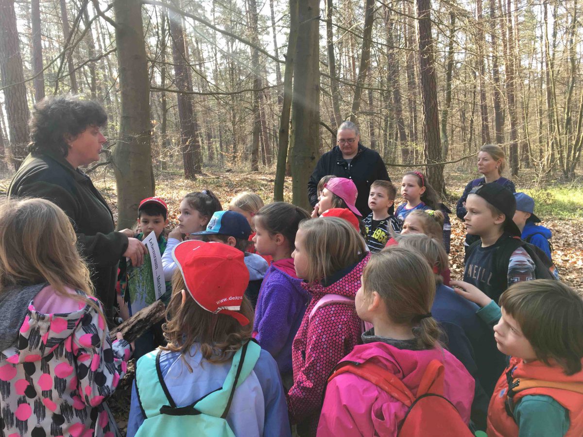 Auf dem Weg wurde mit allen Sinnen wahrgenommen: Wie riecht der Wald? Wie fühlt er sich an? Wie klingt der Wald? Welche Farbe hat er? Auf spielerische Weise führte Rangerin Liane Himm die Jungs und Mädchen an die jeweilige Antwort heran: Es wurden Wurzeln und Tannennadeln an die Nase gehalten, Kiefern und Buchen mit verbundenen Augen ertastet, gurrende Tauben und klopfende Spechte im Wald entdeckt.