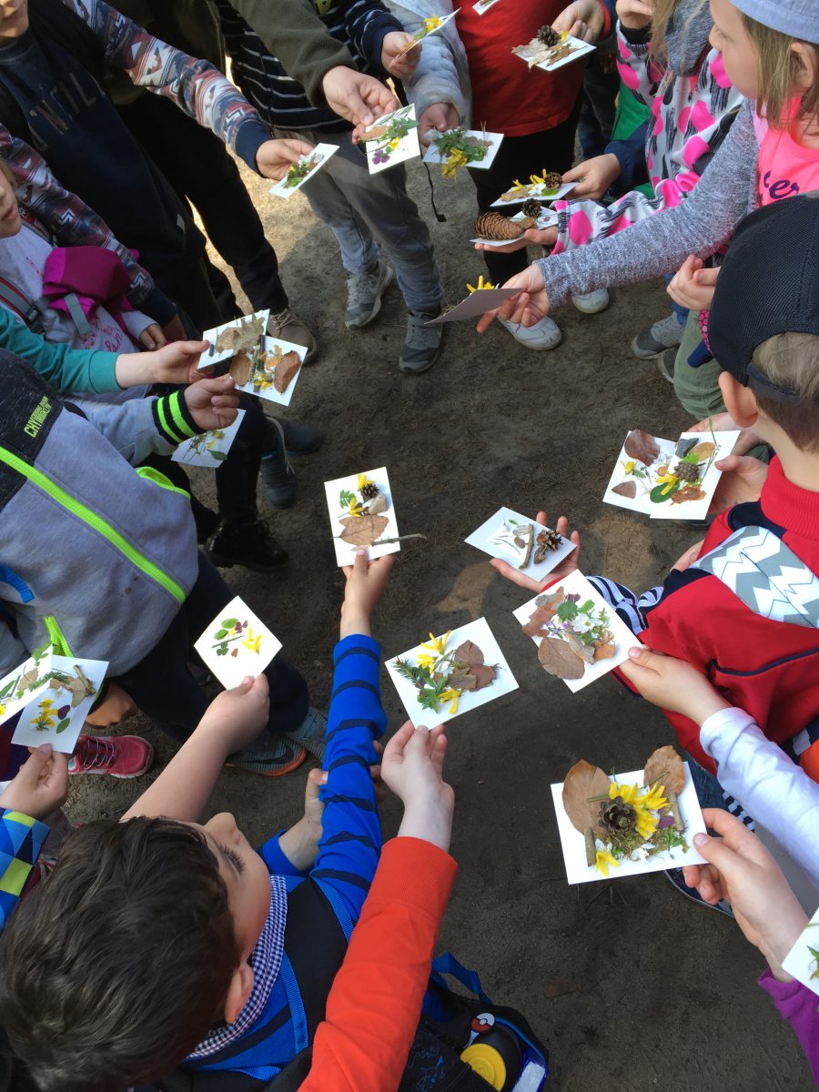 Zum Schluss erfuhren die Erstklässler, dass der Wald viele Farben hat: selbst im April fanden sich neben dem bekannten Grün und Braun hübsche Kleeblätter in Lila und kleine Blüten in Gelb und Weiß für die selbst gestalteten Kunstwerke.