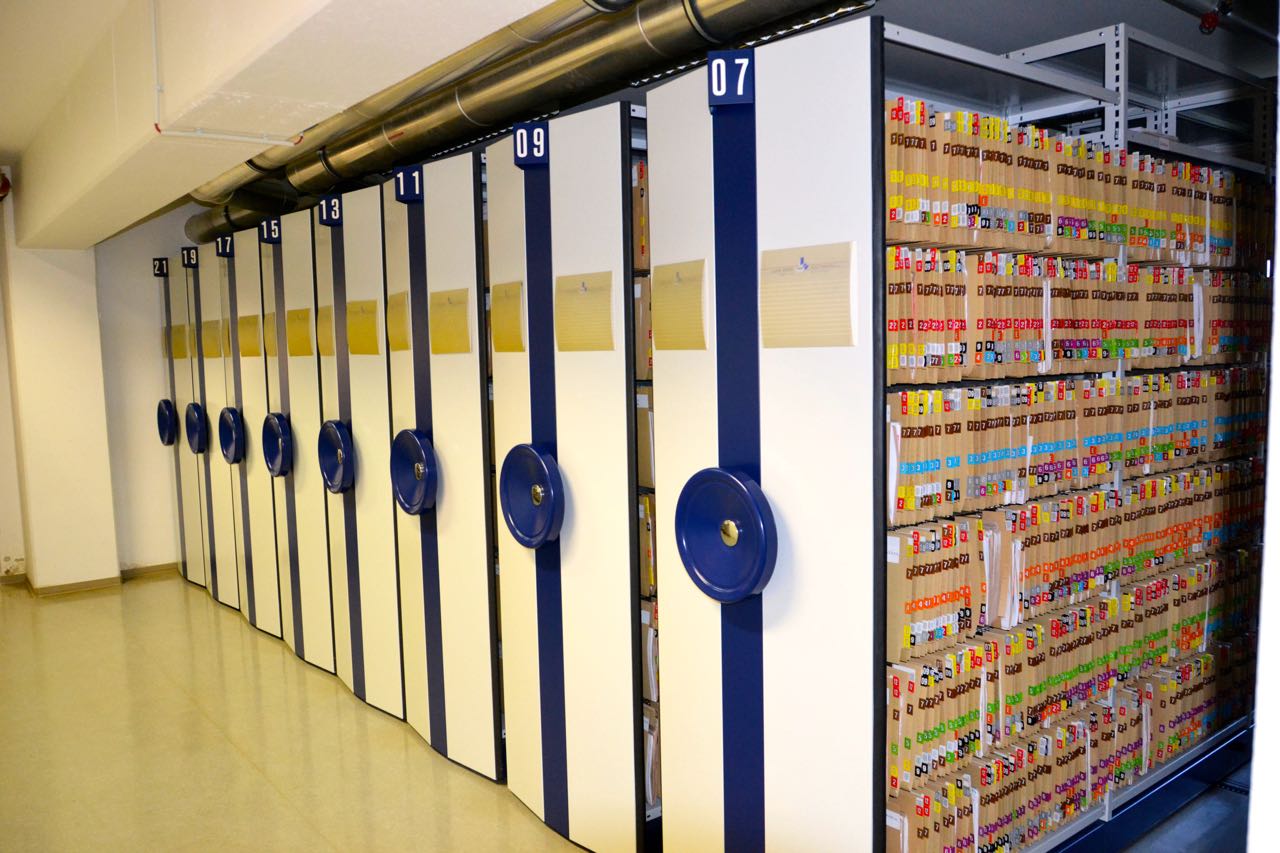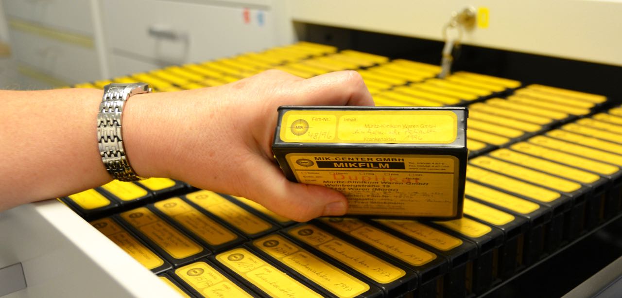 Bei zigtausend stationären Fällen pro Jahr sind schnell die räumlichen Kapazitätsgrenzen erreicht. Neben den klassischen Akten aus Papier, wurden deshalb moderne Archivierungsmethoden eingeführt. So wurden die Dokumente der Patientenakten auf Mikrofilmen gespeichert. In einem Computersystem kann man übrigens genau nachvollziehen, in welchem Format eine Patientenakte im Archiv vorliegt und wo sich eine Patientenakte gerade befindet. Nach Eingabe des Namens des Patienten ist dies in einer Liste ersichtlich. Ist eine Akte auf einem Mikrofilm gespeichert, dann zeigt das System „M“ für Mikrofilm an und die Filmnummer. Die Mikrofilme befinden sich in großen Metallschränken auf dem Flur vor dem Archivbüro.