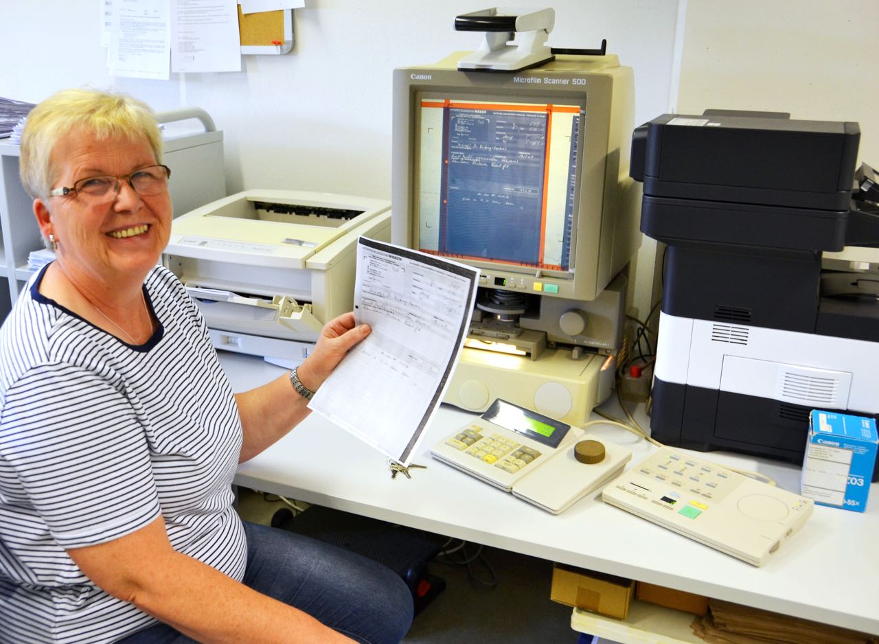 Zur Demonstration, wie diese ausgelesen werden, entnimmt Christa Kies einen der Filme und zeigt mir die Funktion des Mikrofilm Scanners – ein sehr nostalgisch anmutendes Gerät – das sich ebenfalls im Archivbüro befindet. Das Gerät liest den Film aus und zeigt nach Eingabe einer Dokumentennummer die Dokumente auf dem Bildschirm an. Diese können dann nach Bedarf auf einem Standarddrucker auch wieder in Papierform gebracht werden. Es gibt unweit des Büros von Christa Kies einen weiteren Raum, in den sie mich während unseres Gespräches führt. Dort finde ich Regaleweise Aktenordner vor. „Dies sind nur die Dokumente aus den verfilmten Papierakten, die nicht verfilmt werden konnten“. Alleine das sind nochmal Unmengen an Papier, die hier lagern und aufbewahrt werden müssen.
